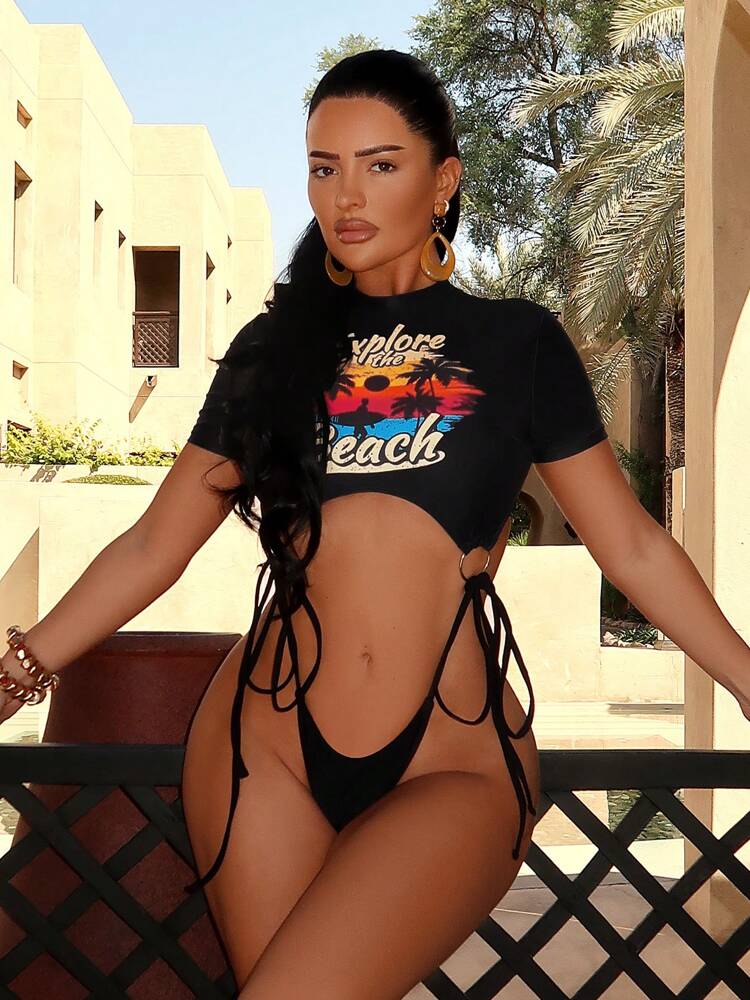 Swim SXY 2pcs Women Summer Beach Vacation Outfit Coconut Tree & Letter Print Round Neck Short Sleeve Top And Bottom Sexy Fashionable Swimwear Set